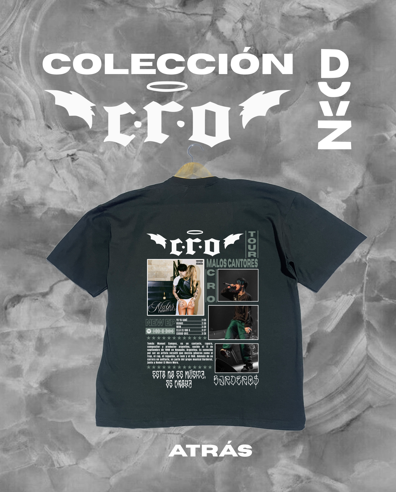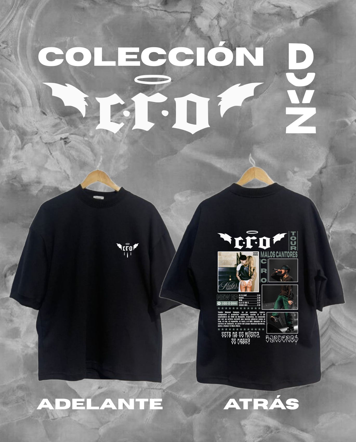 Camiseta de CRO inspirada en la imagen del tour Malos Cantores. Lleva el estilo de CRO con un diseño premium en algodón ultra suave. El merchandising perfecto para los fans de la música urbana en  toda Colombia.